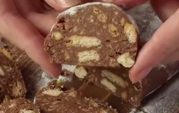 Этот десерт — машина времени. Та самая шоколадная колбаска, которую не нужно печь: густая, хрустящая, с орехами и глубоко шоколадным вкусом.